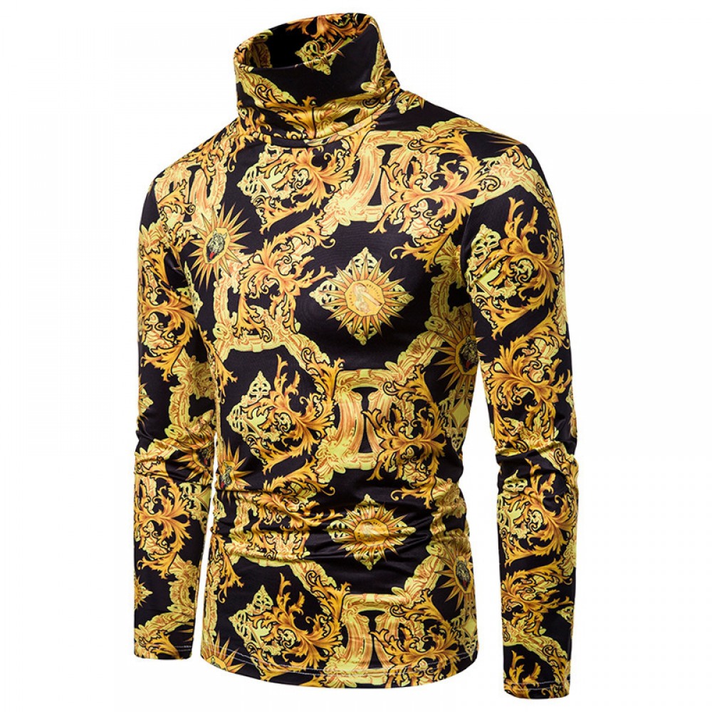 New Men's Large Size 3D Golden Pattern Print High Neck Long Sleeve T-Shirt Bottoming Shirt