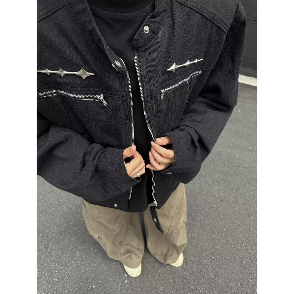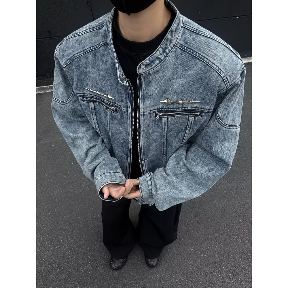Retro Washed Padded Shoulder Short Patchwork Denim Jacket for Men