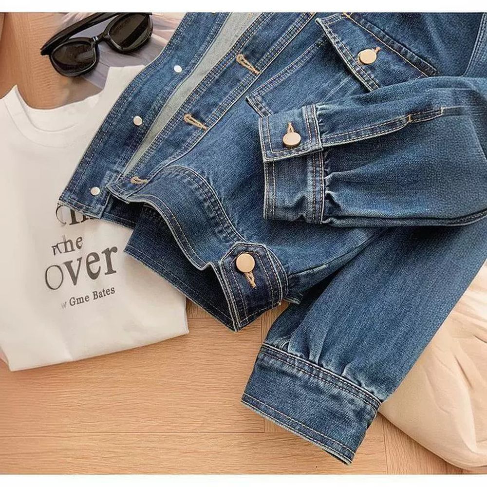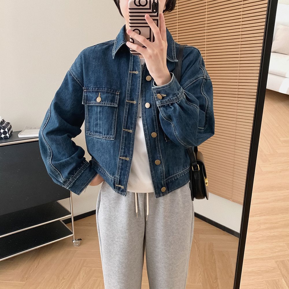 Retro Washed Blue Pocket Short Denim Jacket for Women